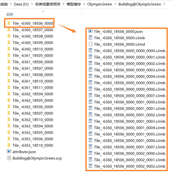 There is a scp file, a json file and many Tile folders in the target folder. scp is a configuration file, which is convenient for product loading model. attribute.json stores attribute fields. There are index files, attribute information files and corresponding s3mb slice files under the tile file on the right.