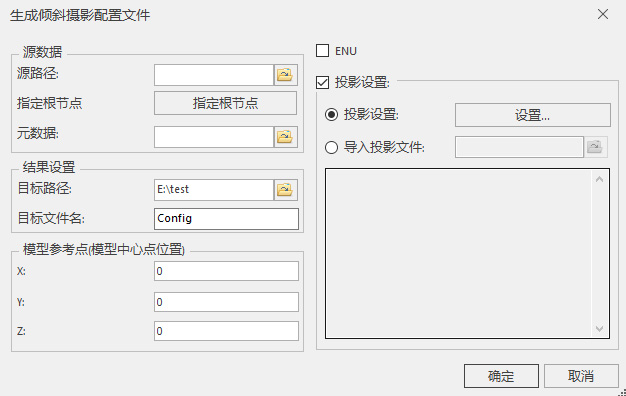 (6). If the oblique photogrammetric model is in the ENU coordinate system, check "ENU". Otherwise, check "Projection Settings" and set the projection information of the *.scp file. Currently, two methods are provided: