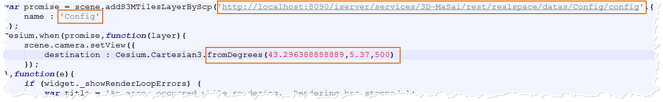 (2) Enter the storage path of WebGL product package (%SuperMap iServer_HOME%/webapps), under the "examples" folder, open "S3MTiles.html "For example, modify the content as shown in the figure below.