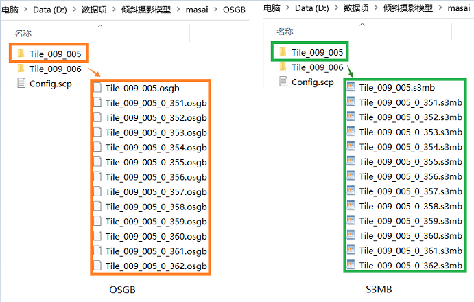 The operation result of "Generate S3M data" is shown on the right side of the figure below. This step generates a target folder consistent with the original file structure; open any model folder respectively, and you can see the OSGB format model and the S3M format model one by one The corresponding relationship is as shown in the figure below.