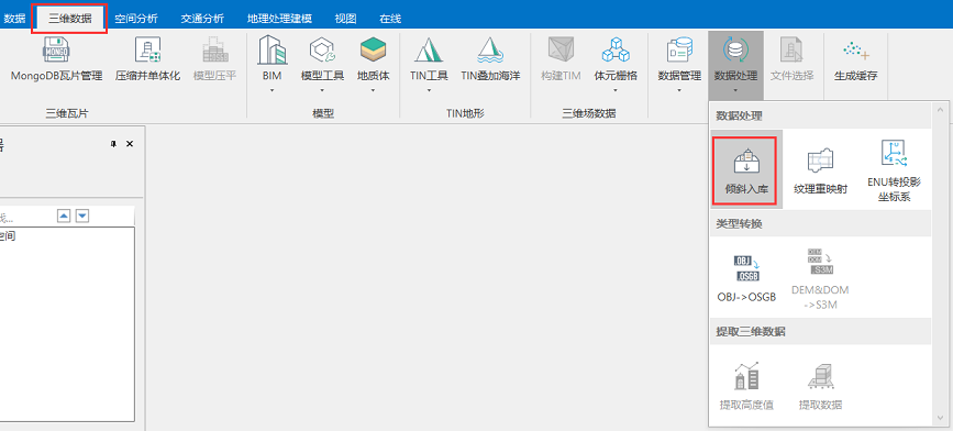 (1). Open SuperMap iDesktop, and click "Tilt Photography" in the "Data Processing" group of the "S3M Data" tab; as shown below.