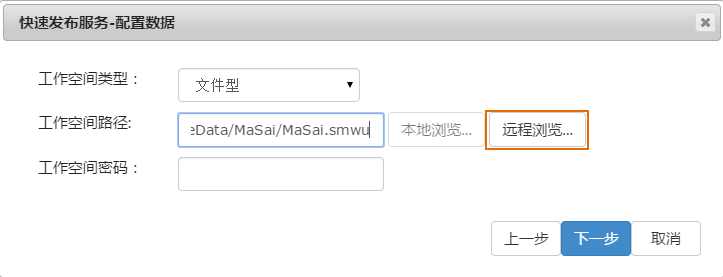 (7). The "Quick Publish Service-Configuration Data" dialog box pops up, click "Remote Browse" button to select the previously saved workspace, click "Next".
